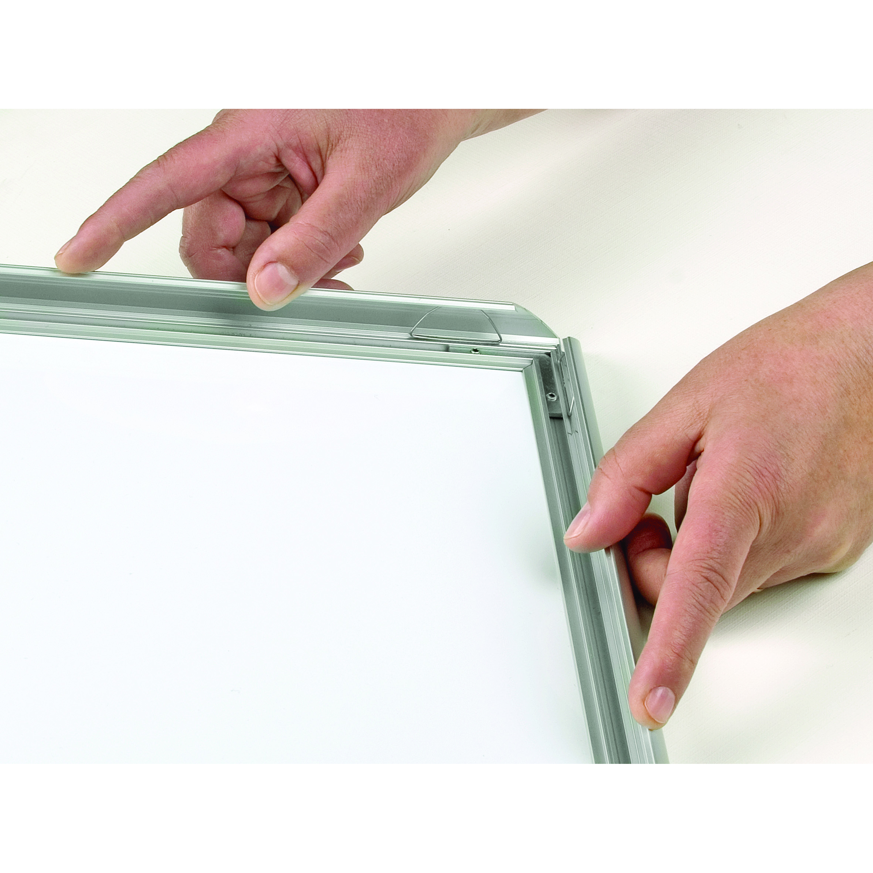 Ideal for displaying posters, information, promotions and more, this Bi-Office Snap Frame features an aluminium frame that snaps open easily, enabling you to quickly change the contents. Ideal for retail, education and general office use, the frame features a clear plastic cover to protect contents. Supplied with a wall fixing kit, this frame is suitable for A3 signs and posters.