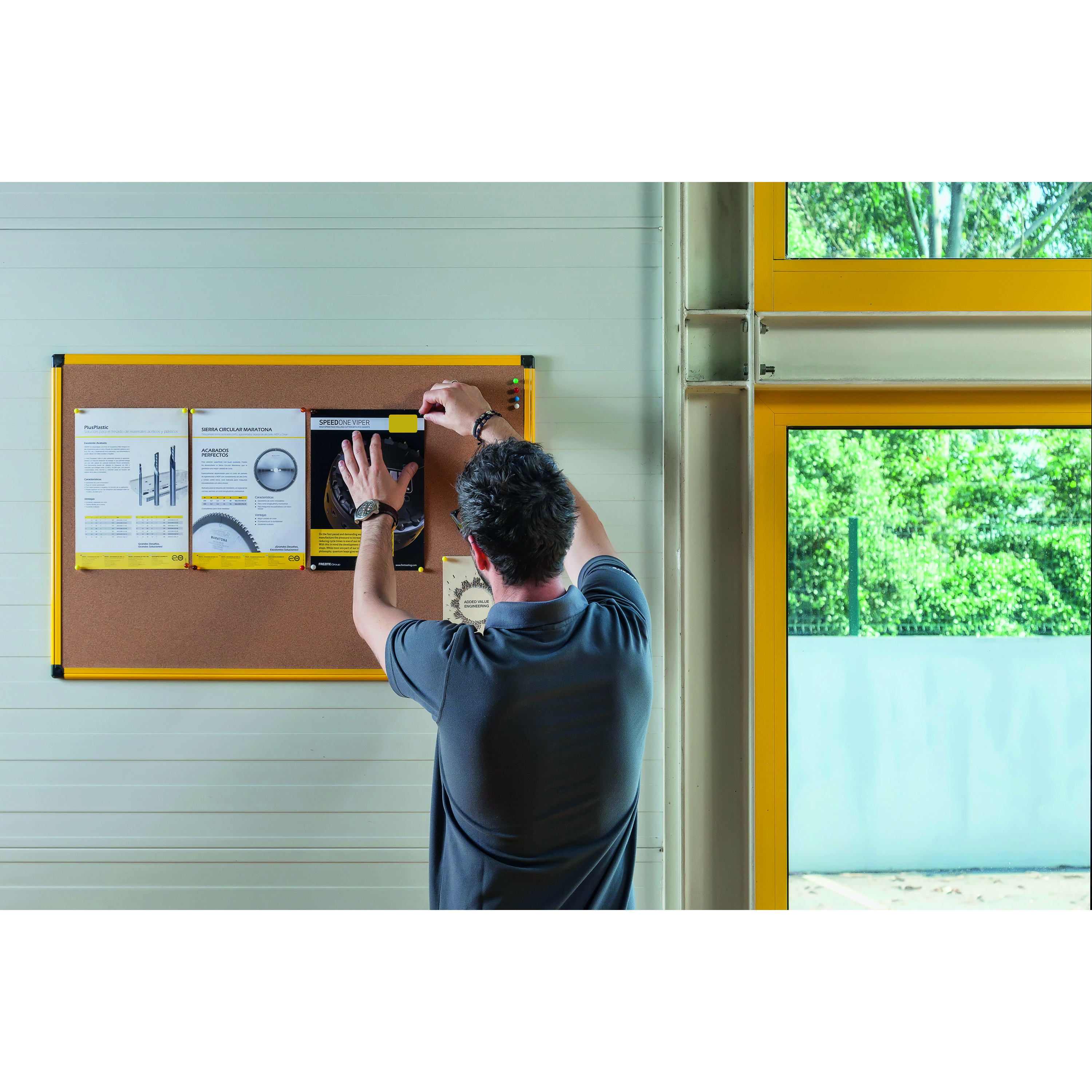The Bi-Office Ultrabrite noticeboard features a cork surface that is self-healing, making it the perfect solution to post messages with any type of pins on the shop floor, warehouse, lean management spaces, industrial facilities corridors, laboratories testing facilities, and many more. In fact, most spaces where notes, notices, images, photos, safety instruction, list and other information has to be posted for display. The highly visible yellow aluminium frame can be mounted both portrait or landscape due to the easy 4-corner mounting system. The product comes with wall fastening kit and a plastic pen tray that can be clipped onto the frame in any position.
