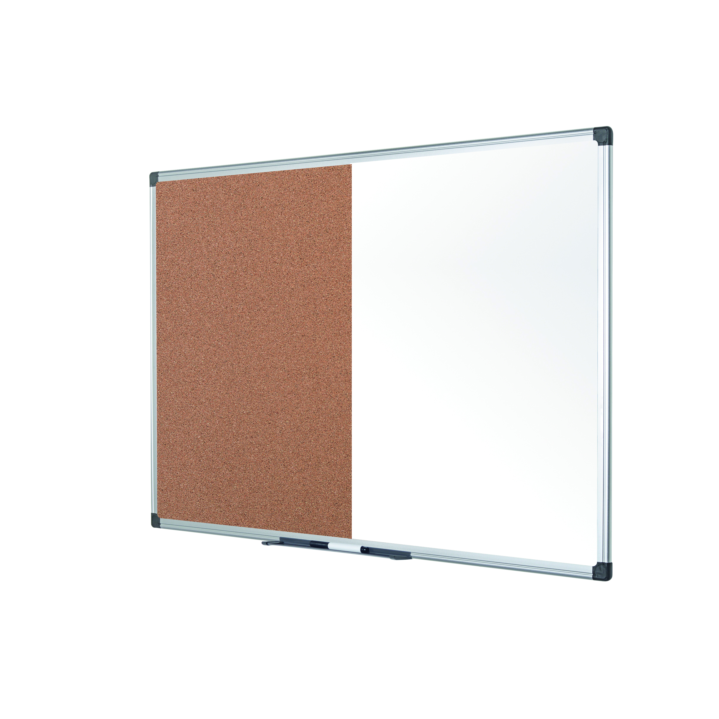 The Bi-Office Maya Non-Magnetic Combination Board is a 2-in-1 product and a sober, adaptable, and efficient option for your home or office. The cork surface is self-healing and resistant, no marks are visible when the push pins are removed. Pin boards are a great way to keep the important information organised and to post reminders. The non-magnetic drywipe surface is suited for moderate use, easy to write on and to clean. You can write text, draw, erase, and do it all over again. Let the creativity flow within the workplace. The set includes a tray to keep accessories at hand and an installation kit for an easy wall mount. Horizontal or vertical wall unit with screws that go through the holes in the plastic corners. This is the simplest, sturdiest, and most robust mounting system around. As a wall-mounted board, its a cost-effective solution that saves room space.