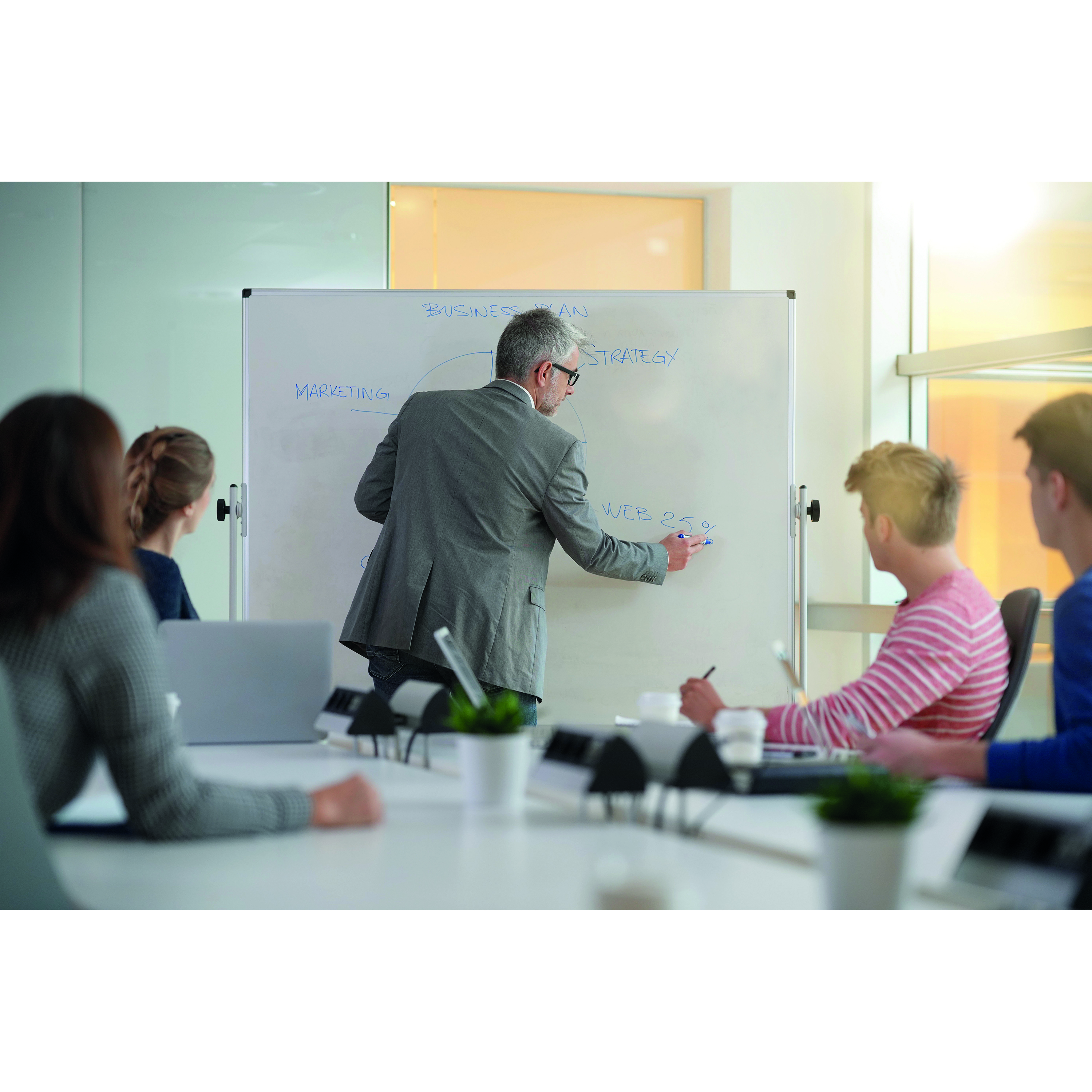 - Economical and practical mobile revolving double sided whiteboard, offering more space to write