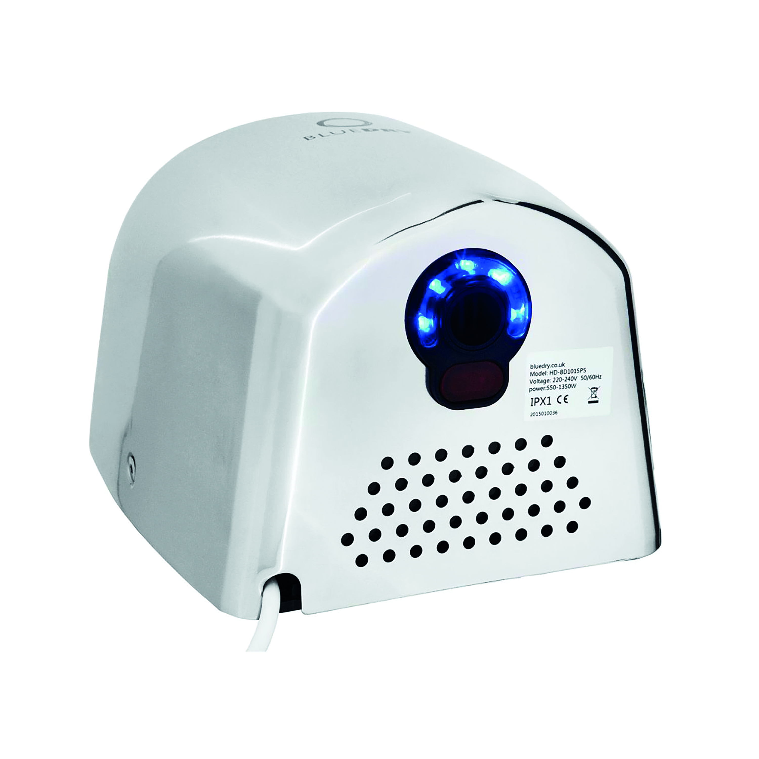 The Bluedry Mini Jet Hand Dryer is one of the most energy efficient models on the market. With a powerful motor, users' hands are dried within 10 seconds to combine minimal energy use with customer satisfaction. The heating element can be set to on or off, offering to dry hands with a heated airflow (1.35kw) or using room temperature air with the element off (550w) to further reduce the energy use. The modern design and robustness make it suitable for high footfall areas. The Anti-Bacterial Air Filter ensures any bacteria or viruses are captured before the air is dispensed onto the users' hands, providing a clean and hygienic airflow on every single hand dry. When the hand dryer is operational, the blue LED light helps to guide the user the optimum positioning for the quickest, most efficient hand drying experience.