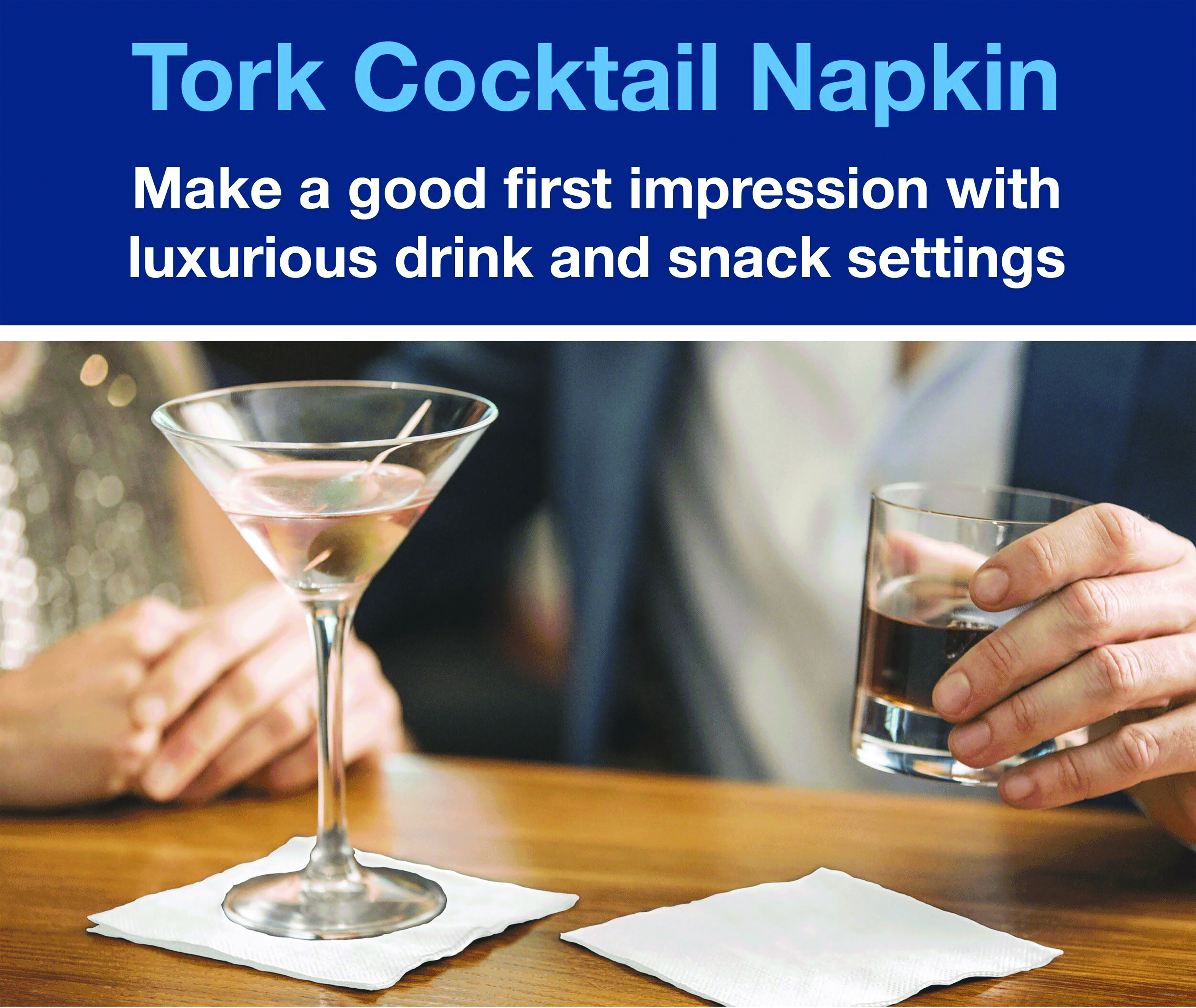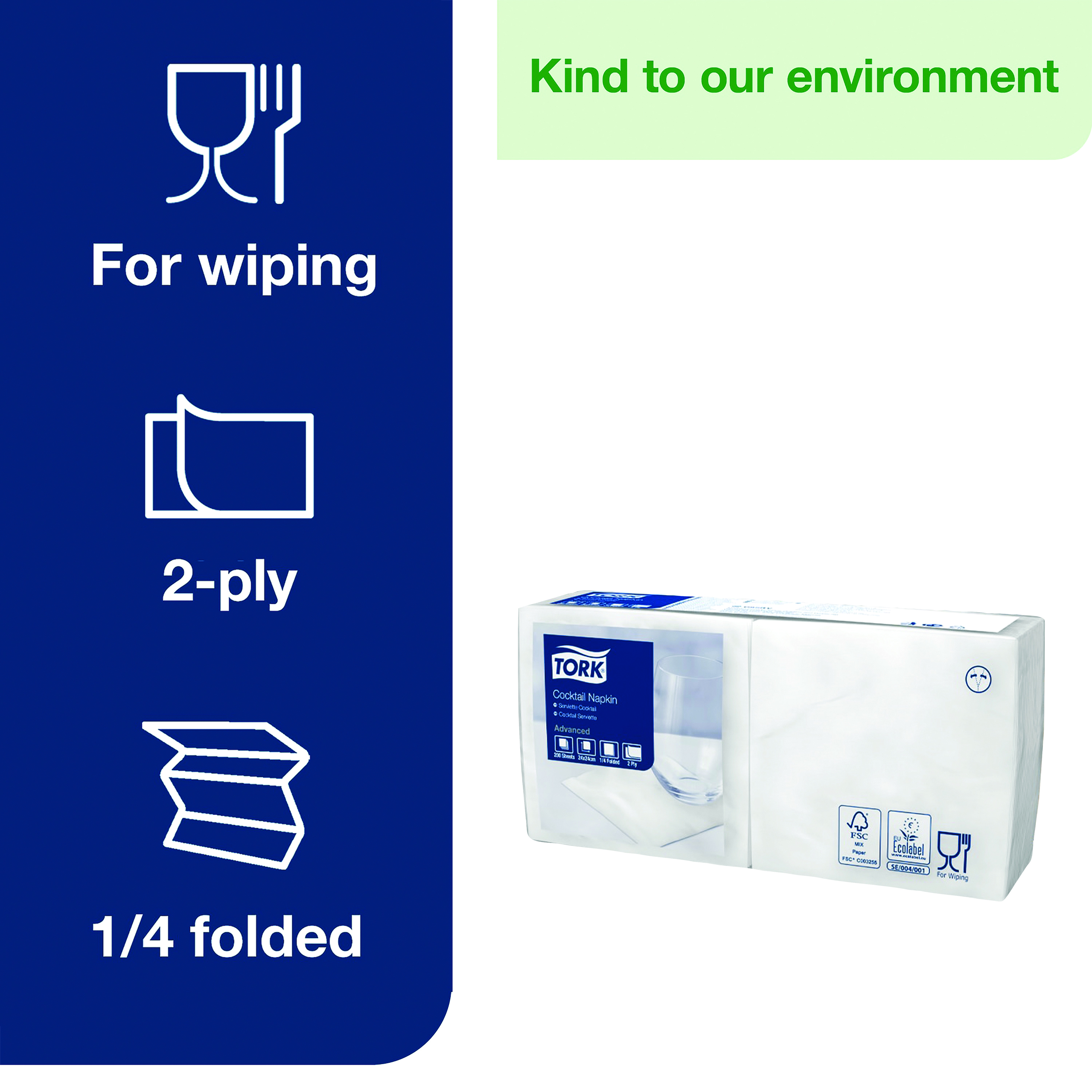 Designed for use in bars and cafes where snacks and drinks are served, these high quality, Tork cocktail napkins are simple and elegant. Featuring a soft yet durable 2-ply construction, each white napkin measures 240 x 238mm (unfolded). This bulk pack contains 200 napkins for everyday use, keeping tables looking stylish and hygienic.